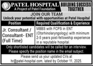Only male candidates can apply for A Patel Hospital Foundation Jobs In Pakistan October 2025 Qualification /Experience Required MBBS with FCPS in ENT (Otorhinolaryngology) with minimum 2-5 years post-fellowship experience in a reputable hospital. and more experienced candidates should apply before 11October 2025.