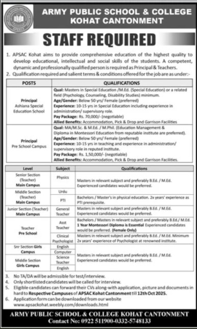 Army Public School And College, Kohat Cantonment, Jobs In Lahore, October 2025 Advertisement