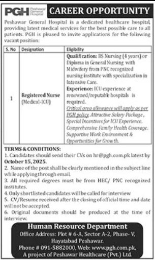 Only male candidates can apply for Human Resource Department Jobs In Peshawar, October 2025 Qualification /Experience Required:Qualification: BS Nursing (4 years) or Diploma in General Nursing with Midwifery from PNC recognized nursing institute with specialization in Intensive Care. Experience: ICU experience at renowned/reputable hospitals is required and more experienced candidates should apply before 15 October 2025.