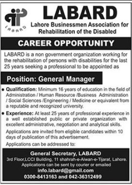 Candidates if you are seeking Labard Businessmen Association For Rehabilitation Jobs In Lahore October 2025 if yes. It would be best if you tried to complete the Businessmen Association For Rehabilitation job because you can easily apply for these vacancies General Secretary, LABARD). Only male candidates can apply for Labard Businessmen Association For Rehabilitation Jobs In Lahore, October 2025 Qualification /Experience Required:Qualification: Minimum 16 years of education in the field of Administration/Human Resource /Business Administration /Social Sciences /Engineering/Medicine or equivalent from a reputable and recognized university Experience: At least 25 years of professional experience in a well established public or private organization with excellent administrative, negotiation and analytical skills. and more experienced candidates should apply before 20 October 2025.