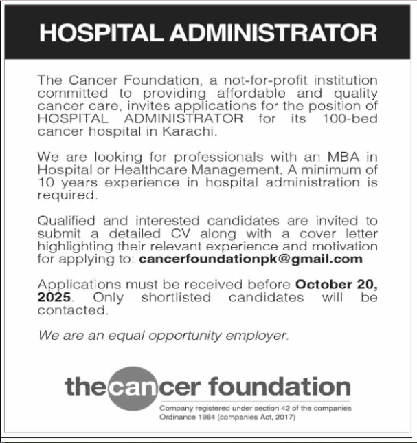 Candidates if you are seeking The Cancer Foundation Company Jobs In Karachi October 2025 if yes. It would be best if you tried to complete read tThe Cancer Foundation Company job because you can easily apply for these vacancies HOSPITAL ADMINISTRATOR. Only male candidates can apply for The Cancer Foundation Company Jobs In Karachi October 2025 Qualification /Experience Required:We are looking for professionals with an MBA in Hospital or Healthcare Management. A minimum of 10 years experience in hospital administration is required Qualified and interested candidates are invited to submit a detailed CV along with a cover letter highlighting their relevant experience and motivation and more experienced candidates should apply before 20 October 2025.